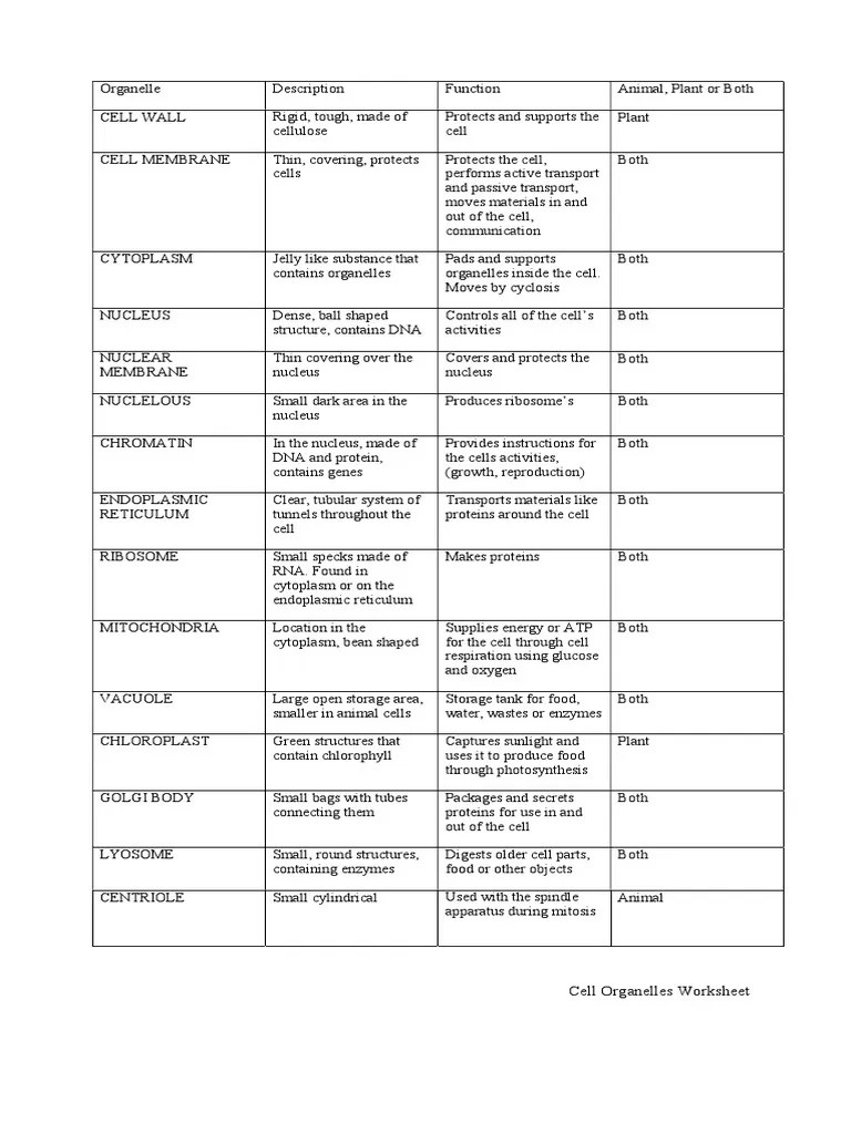 Cell Organelles Worksheet Answers